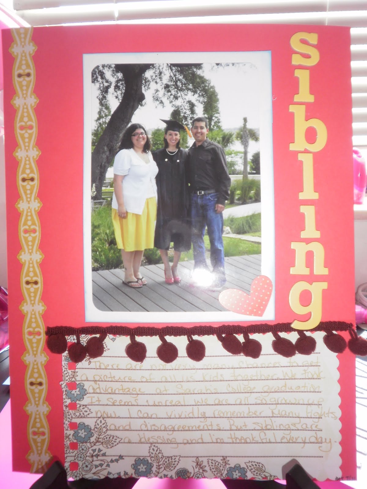 I was lucky enough to find a great group of women, who share my love for all things crafty. We just started doing a monthly challenge. This months was to use no patterened paper 0_0.. I only have 8.5x11 non patterened paper. So I was alittle out of my comfort zone. I had this picture of my sister, brother and I from May 2010 and I wanted to get it scrapped for some time. This seemed to be the perfect layout. It all worked out.